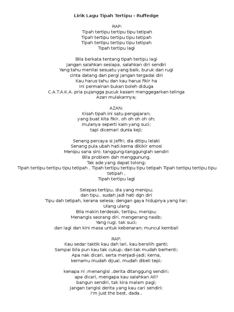 Berikut cuplikan syair nyanyian / teks dari lagunya: Lirik lagu dari kau tipu aku, betapa remuk jantungkukau tipu akukau tipu akubetapa sakit hatikukau buang akukau buang akuku tatap…. Am f c g am f betapa remuk jantungku c kau tipu aku. Kau buang aku ku tatap langit yang hitam saat menanti malam kau pun tak kunjung datang kau buat gelap pelangi lalu kau datang lagi Kau jangan mencoba untuk di sini. Saat ku terluka kau dengan siapa. Kau tipu kau tipu aku lagi. Kau tipu aku / saat menanti malam / kau pun tak kunjung datang kau buat gelap pelangi / kau jangan . Am f c g am f betapa remuk jantungku. Lirik lagu kau tipu aku oleh kangen band betapa remuk jantungku. Pastikan anda sudah melihat video musiknya.